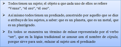| Para la logia estos juicios o enunciados no son más que ejemplos de una forma de pensamiento que se diferencia de otras, por ejemplo, del concepto y del razonamiento. Para obtener la forma de los juicios nos fijamos en los elementos que son comunes a todos: | |