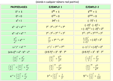 Leyes de potencia. 1. Todo número elevado a la cero da como resultado 1. 2. Todo número elevado a la 1 da como resultado el mismo número. | |