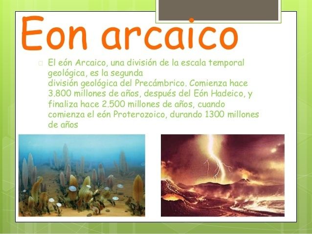 | Aparecen las primeras formas de vida, bacterias fotosintetizadoras, que contribuyeron a la formación de una atmósfera rica en O2 y N Arcaico superior 3000 a 2500 Ma Arcaico inferior 3800 a 3000 Ma | |