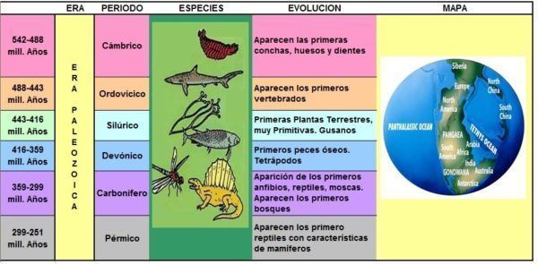 | Era Paleozóica Ocurre la fragmentación de Rodinia para formar Pangea y la primera radiación adaptativa, los animales desarrollaron caparazón y esqueleto. Todos los seres vivos eran acuáticos hasta el final, donde algunos colonizaron ambientes terrestres | |