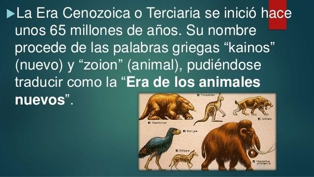 | Periodo Terciario Se diversifican los mamíferos placentarios y las aves. Aparecen las selvas ecuatoriales, las sabanas y los pastizales, comienzan las glaciaciones en el Polo Norte. Se comunican América del Norte y del Sur. Aparece el Australopithecus | Periodo Cuaternario Se acentúan las diferencias en temperaturas de las zonas templadas y tropicales, ocasionando cambios bruscos del clima. Se forma el permafrost, predominan los grandes mamíferos. Aparece el humano |
