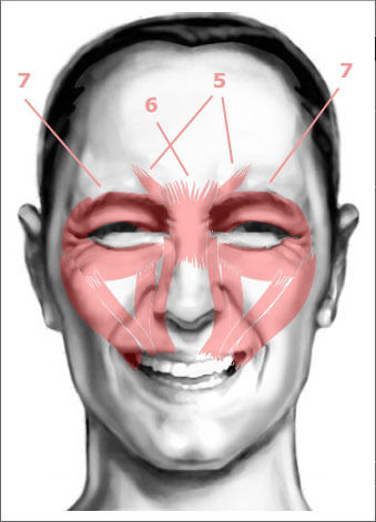 | -M.orbicular de la boca -M.procer -M.depresor del supercilio -M.orbicular del ojo -M.elevador del labio superior y ala de la nariz |