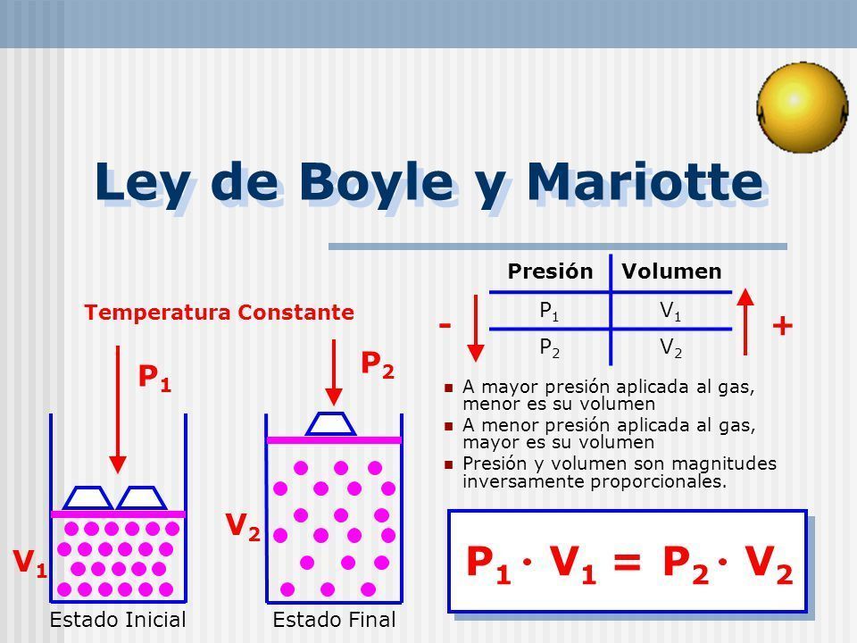| LEY DE BOYLE Esta ley fue formulada tanto por Boyle como por el botánico francés Edme Mariotte de manera independiente en 1662 y 1676 respectivamente. | Es una de las leyes que determinan el comportamiento de los gases. Establece que si la temperatura se mantiene constante, el volumen y la presión de una cierta cantidad de gas tienen una relación inversamente proporcional. Si el volumen del gas aumenta, la presión disminuye; si la presión aumenta, el volumen disminuye. Esto dado que la temperatura sea siempre la misma. Matemáticamente, este principio se expresa así: P.V = k, donde k es la constante de temperatura. |