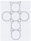 | CUBO TRUNCADO O TRIACONOCTAEDRO: Este cuerpo tiene seis caras octogonales y ocho triangulares. Cuando se monta este cuerpo, que está dibujado abierto, tiene veinticuatro vértices y treinta y seis aristas. Cada uno de los seis cuadrados es concéntrico a una de las caras del cubo; cada lado de una cara cuadrada es el lado de un triángulo equilátero. | |