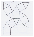 | CUBOCTAEDRO TRUNCADO: Este cuerpo irregular también es conocido como la red de Durero. Cuando está abierto, tiene seis caras octogonales, ocho hexagonales y doce cuadradas, y cuando se monta, tiene cuarenta y ocho vértices y setenta y dos aristas. |
