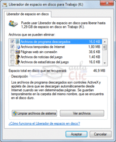 | Liberar espacio en disco Esta herramienta es muy útil ya que permite vaciar el disco de información que no se está utilizando, como por ejemplo los archivos temporales del sistema, de Internet e incluso vaciar la papelera. | Accedemos desde el menú Inicio > Todos los programas > Accesorios > Herramientas del sistema > Liberador de espacio en disco. Nos preguntará qué unidad queremos liberar y al Aceptar la analizará en busca de archivos prescindibles. Cuando acabe, mostrará la siguiente ventana: |