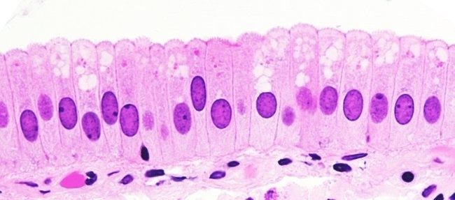 | Localización y función del epitelio cilíndrico simple no ciliado | Localización: Tapiza el tubo digestivo, conductos de glándulas y vesícula biliar Función: secreción y absorción |