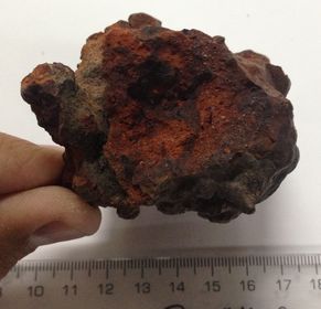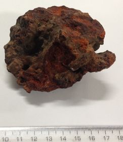 | Muestra: 3 Laterita | CARACTERÍSTICAS MACROSCÓPICAS ASPECTOS GENERALES: Roca ligera, de textura rugosa, intensamente alterada, por proceso prolongados de meteorización química. Compuesta principalmente de cuarzo, oxido de hierro y magnesio. COLOR: 5YR 6/8 TAMAÑO DE GRANO: Arena fina (0,063 mm) FORMA DE LOS GRANOS: No es visibles. ESTRUCTURAS SEDIMENTARIAS: Post-Depositacional. TIPO DE ROCAS: Laterita OBSERVACIONES: Roca de origen continental, formada en las zonas tropicales cálidas y húmedas, producto de la lixiviación de las rocas preexistentes, durante repeticiones de las estaciones húmedas y secas. Su color roja es debido a la oxidación de los oxidos de hierro, consecuencia de la intensa intemperie de larga duración que sufrió la roca. |