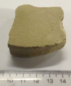 | Muestra: 1 Arcilla. | CARACTERÍSTICAS MACROSCÓPICAS ASPECTOS GENERALES: Presenta textura fina, muy suave al tacto, se observan algunos minerales de cuarzo y micas. COLOR: 10YR8/2. TAMAÑO DEL GRANO: Arcilla (<0,002 mm). FORMA DE LOS GRANOS: No es visible. ESTRUCTURAS SEDIMENTARIAS: Laminación Horizontal. TIPO DE ROCA: Arcilla. OBSERVACIONES: Algunas laminas presentan oxidación, esto es producto de fluctuaciones temporales del nivel freático. Esta roca se originan en diversos ambientes, en climas áridos, donde las precipitaciones son escasas. |