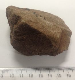 | Muestra: 5 Arenisca | CARACTERÍSTICAS MACROSCÓPICAS ASPECTOS GENERALES: Roca masiva, dura, compuesta esencialmente por cuarzo, micas, unidas por oxido de hierro. COLOR: SYR 6/4. TAMAÑO DEL GRANO: Arena fina (0,063 mm). FORMA DE LOS GRANOS: No son visible. ESTRUCTURAS SEDIMENTARIAS: No presentan. TIPO DE ROCA: Arenisca. OBSERVACIONES: Roca de ambientes continental. El oxido de hierro se encuentra en estado oxidado, tiñendo la roca a tonalidades rojizas. |