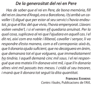 | Escriu els sinònims que usa el narrador per parlar de les qualitats del rei en Pere | Els adjectius que fan referència a les qualitats del rei són: noble, lliberal, cavaller i senyor |