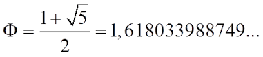 El número áureo φ (phi) (en minúscula) o Φ (Phi) (en mayúscula) | Es un número irracional en honor a Fidias. Se expresa por esta fracción: |
