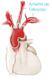 Arteritis de Takayasu | Es un tipo de vasculitis que afecta a vasos sanguíneos de tamaño medio y grande, sobre todo a la aorta. Su causa es desconocida, pero se sabe que suele afectar más a las mujeres. Los síntomas más comunes son fiebre, pérdida peso, disminución del pulso e isquemia entre otros. Esta enfermedad se trata con fármacos como los glucocorticoides y los inmunosupresores. |