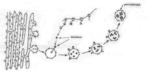 peroxisomas | peroxisomas son pequeñas esferas presentes tanto en células vegetales como en animales. funciona para el rompimiento de acidos grasos y la fabricación de colesterol. |