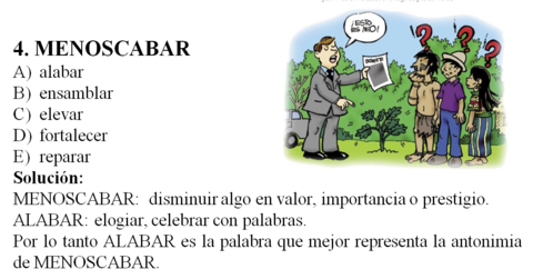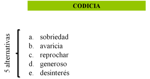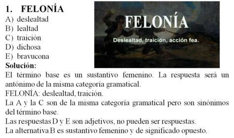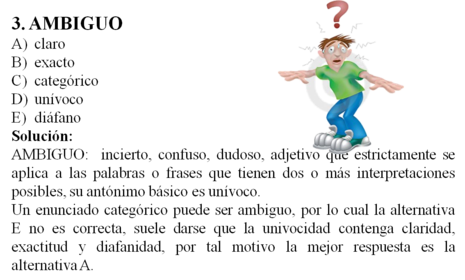 | Aplicar la regla de oro. Analizar las alternativas con una oración y optar por la palabra cuyo significado sea la más cercana al de la premisa. La respuesta será siempre el antónimo más opuesto. Técnicas emergentes. (serán analizadas oportunamente) | |