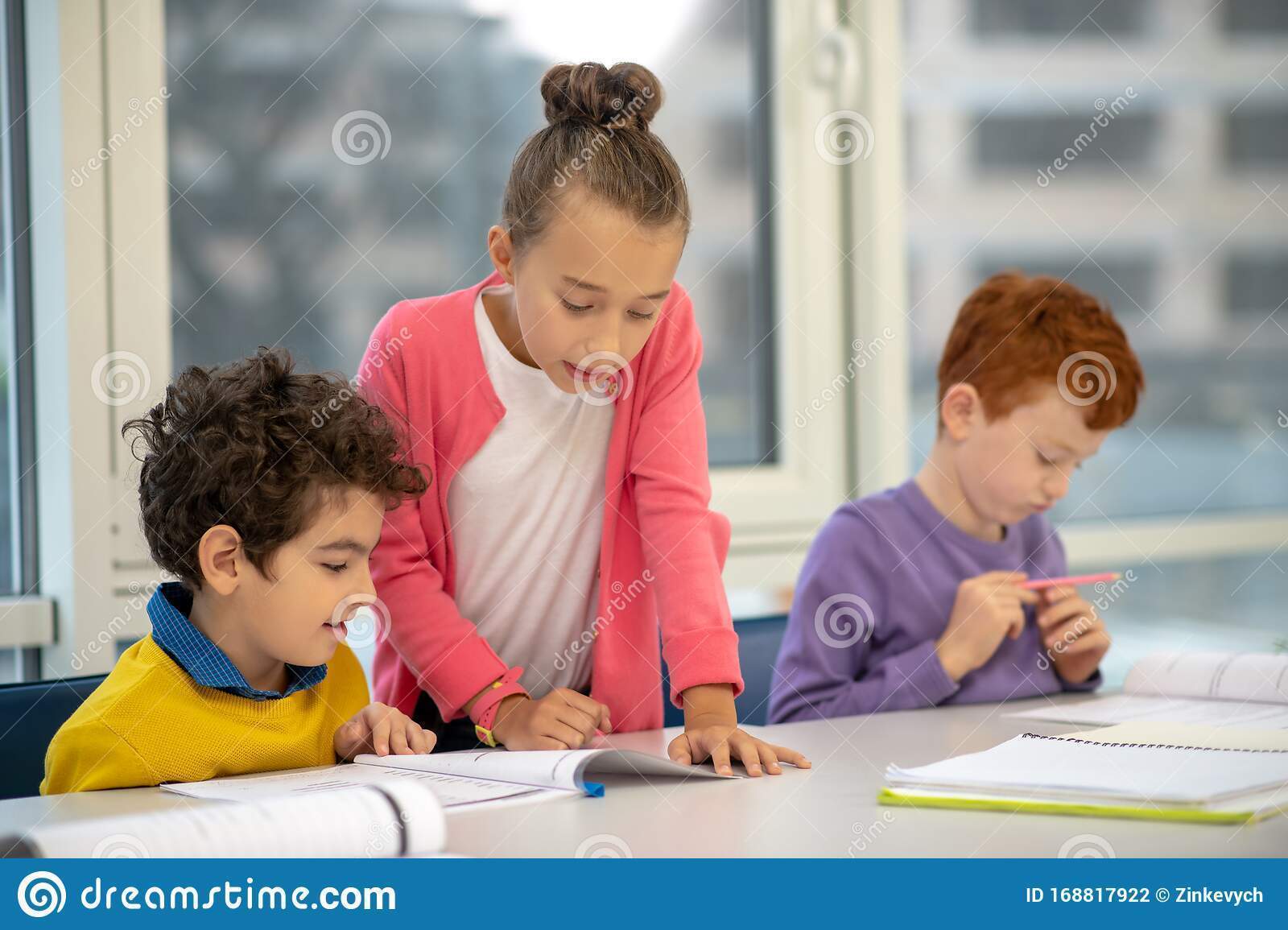 | Das Mädchen erklärt SEINEM MITSCHÜLER die Aufgabe. | Das Mädchen erklärt ihm die Aufgabe. |