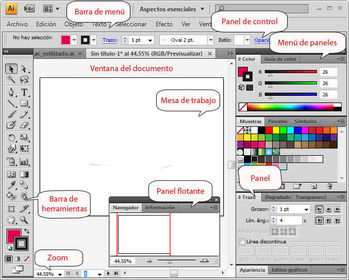 El área de trabajo El entorno de Illustrator se compone por una serie de paneles, barras y ventanas, que podemos mover y desplazar. Y cualquier disposición de estos elementos se conoce como área de trabajo. Vamos a ver más detalladamente cuáles son estos elementos. Para que se muestren los paneles, prueba a abrir una imagen o un documento ya creado. | |
