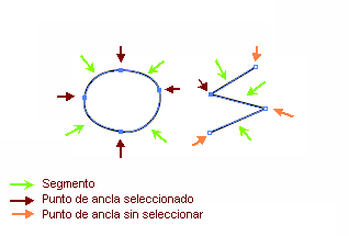 La diferencia entre un trazado vectorial y un trazo dibujado en un mapa de bits, es que el trazado vectorial es un objeto, que podemos seleccionar, modificar y eliminar, y que a su vez tiene otros elementos que nos permiten hacer todo esto. Para verlo mejor, vamos a seleccionar los trazados haciendo clic sobre ellos con la herramienta Seleccionar Selección. Cada uno de estos trazados se divide en segmentos, que pueden ser curvos o rectos. Distinguimos cada segmento porque se delimita con un cuadradito, tanto en el extremo como en la unión con otro segmento. Estos cuadraditos son los puntos de ancla, y aparecen oscuros cuando están seleccionados, y claros cuando no. |
