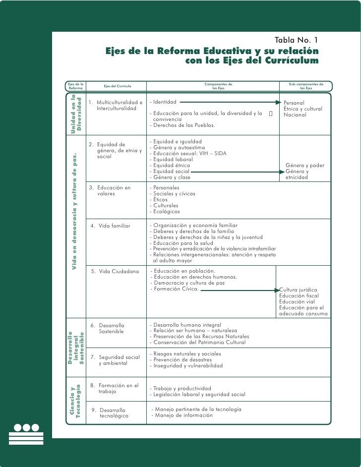 | Ejes de la Reforma Educativa y su Relación con los Ejes del Curriculum | - Unidad en la diversidad. 1. Multiculturalidad e interculturalidad. - Vida en democracia y cultura de paz. 2. Equidad de género, de etnia y social, 3. Educación en valores, 4. Vida familiar, 5. Vida Ciudadana - Desarrollo integral sostenible. 6. Desarrollo sostenible, 7. Seguridad social y ambiental - Ciencia y Tecnología. 8. Formación en el trabajo, 9. Desarrollo tecnológico. |