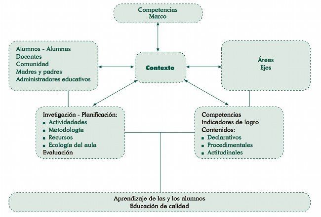| Componentes del Curriculum | - Competencias: Competencias Marco, Competencias de Ejes, Competencias de Área y Competencias de grado o etapa. -Contenidos, declarativos, procedimentales y actitudinales - Indicadores de logro |