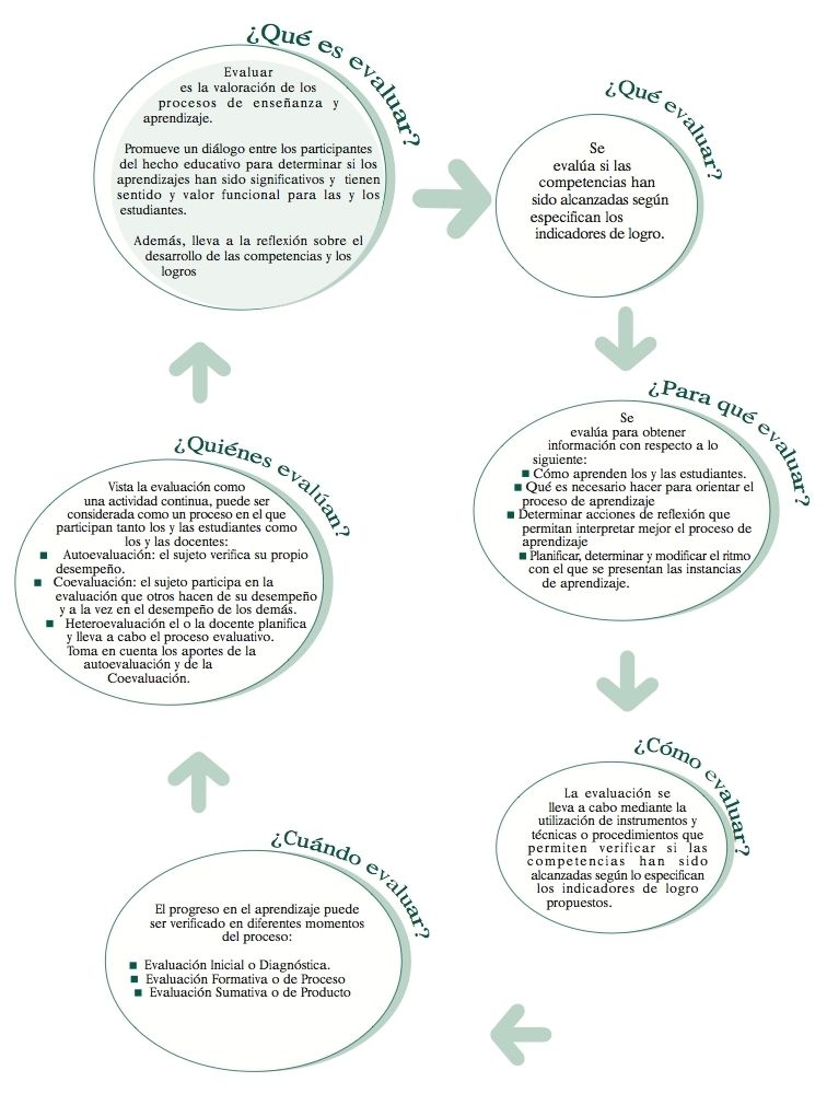 - Funciones de la evaluación: Inicial o Diagnóstica, de Proceso o Formativa, de Resultados o Sumativa. - Características de la evaluación: Continua, integral, sistemática , flexible, interpretativa y participativa. - Técnicas de evaluación que se sugieren: Técnicas que se basan en la observación, listas de cotejo, escalas de rango, rubricas. Técnicas que enfocan el desempeño, preguntas, portafolio, debate, ensayos, etc. |