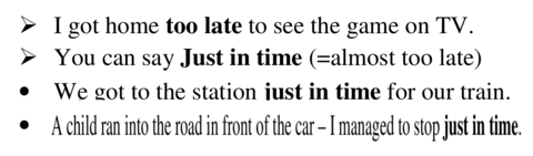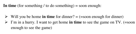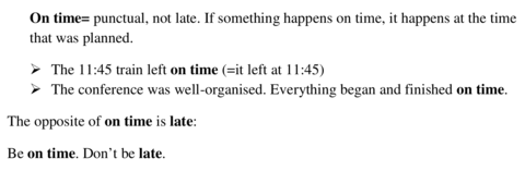 | Introduction | Ana is never late, she is always on time. Move on! You have to be there in time to dress up for the party You are just in time to take bus. |