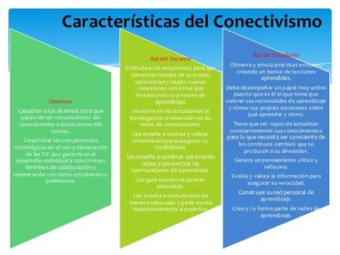 | Rol del alumno | El enfoque conectivista está centrado en el estudiante ya que pretende que cada alumno cree una red de aprendizaje de acuerdo con sus intereses y necesidades personales. Por este motivo, el estudiante se sitúa en el centro del proceso de aprendizaje. Autonomía es el concepto clave a la hora de hablar del rol del estudiante. |