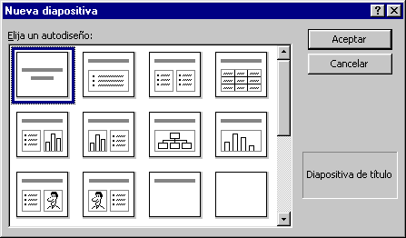 autodiseño de texto en power point: Los autodiseños son los que permiten establecer la estructura de una diapositiva.Cuando se crea una diapositiva se selecciona entre 24 autodiseños. | |