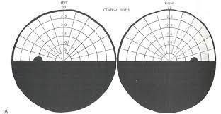 | Hemianopcia altitudinal | 50% del campo visual afectado en la mitad superior o inferior, afección de fibras superiores o inferiores y por lesión del quiasma óptico |