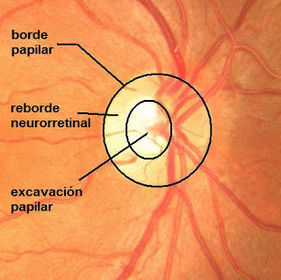 | Papila óptica | El lado nasal de la retina, donde emergen los vasos sanguíneos con borde circular. Posee una excavación central |
