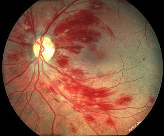 | Hemorragias retinianas | En pacientes hipertensos y con diabetes. Vasos sanguíneos delgados y pequeños (retinopatía proliferativa) |