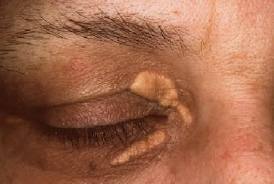 | Xantelasma | Acúmulo de lípidos en placas sobreelevadas sobre el ángulo interno de los párpados |