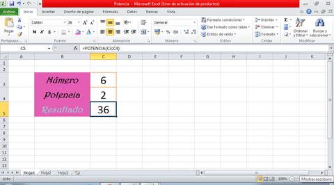 ¤ Potencia Devuelve el resultado de elevar el argumento número a una potencia.. Número: Obligatorio. El número base. Puede ser cualquier número real. Potencia: Obligatorio. El exponente al que se desea elevar el número base. | |