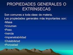 | Propiedades extrínsecas | Las propiedades generales son las propiedades comunes a toda clase de materia; es decir, no nos proporcionan información acerca de la forma como una sustancia se comporta y se distingue de las demás. |