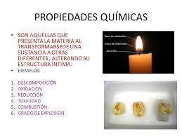 | Propiedades químicas | Una propiedad química es cualquier propiedad en que la materia cambia de composición. |