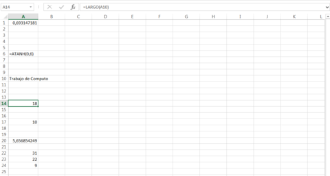 | Texto: "LARGO" "LARGO" devuelve el número de caracteres de una cadena de texto contando los espacios, diciéndonos el total de estos en el espacio seleccionado. En este caso la función marca los 18 caracteres de la frase "Trabajo de Computo". | |