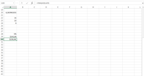 | Financieras: "VNA" "VNA", esta función nos permite saber el valor neto presente en una inversión a partir de una tasa de descuento y una serie de futuros pagos. En este caso son invertidos netamente $230,48 a partir de la tasa de descuento aplicada al valor 1 el cual tiene como valor $242. |