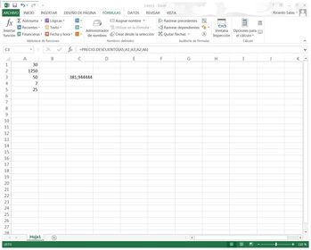 | Financieras: "PRECIO.DESCUENTO" Devuelve el precio por un valor nominal de 100 $ de un valor bursátil con descuento. | |
