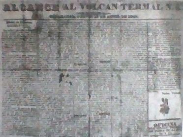 | "VOLCAN TERMAL" fue el primer bisemanario impreso en esta antigua prensa cajamarquina. | - Hoja de tamaño tabloide, el precio de venta era de un real. -Registraba como secciones: *Interior. *Exterior. *Crónicas. *Aviso. *Vriedades *Remitidos. |