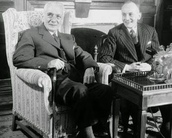 De izquierda a derecha, (Alberto Lleras Camargo, junto con Laureano Gomez Castro) | El liberal Alberto Lleras Camargo y el conservador Laureano Gómez firmaron el Pacto de Benidorm, el 24 de julio de 1956, para dar inicio al Frente Nacional en el cual los partidos se turnarían la presidencia y se repartirían la burocracia a los diferentes niveles de gobierno en partes iguales hasta 1974, es decir cuatro períodos presidenciales: dos liberales y dos conservadores. |
