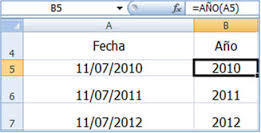 AÑO (función AÑO) En este artículo se describe la sintaxis de la fórmula y el uso de la funciónAÑO en Microsoft Excel. Descripción Devuelve el año correspondiente a una fecha. Devuelve el año como número entero comprendido entre 1900 y 9999. Sintaxis AÑO(núm_de_serie) La sintaxis de la función AÑO tiene los siguientes argumentos: | |