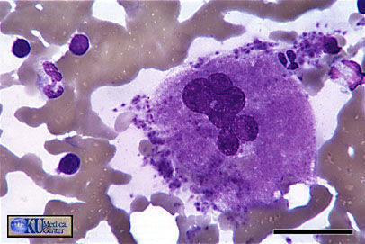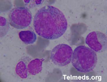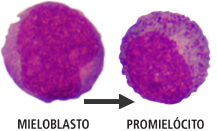 Promielocito | Célula de gran tamaño (que puede ser similar a la precursora) capaz de sufrir mitosis. Posee un núcleo esferoidal grande y gránulos azurófilos (primarios) en su citoplasma (Pawling y Ross, 2007). Aún se observa basofília. |