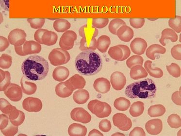 Mielocito (neutrófilo, basófilo y eosinófilo) | Célula más pequeña que el promielocito, la última capaz de dividirse mitóticamente y con nucléolos poco visibles. Poseen un núcleo más o menos esferoidal que cada vez se torna más hipercromático y adquiere una escotadura bien definida. Los gránulos específicos de cada tipo de célula granulocítica empiezan a surgir (Rodak, 2005). |