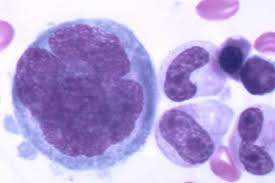Mieloblasto | Célula con actividad mitótica, posee un núcleo esferoidal eucromático grande con 3 a 5 nucléolos. Mide de 14 a 20 um de diámetro y posee una relación núcleo citoplasma alta. La pequeña cantidad de citoplasma agranular es intensamente basófilo (Rodak, 2007). |