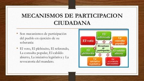 | mecanismos de participación ciudadana | Los mecanismo de participación ciudadana son los medios por el cual el pueblo puede ejercer para: elegir sus representantes, intervenir, participar, aprobar o revocar en todo que contribuya el bien común de la sociedad o como nación. |