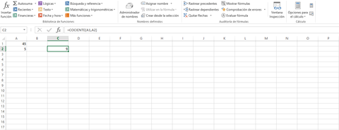 | Matemáticas y trigonométricas: "COCIENTE" COCIENTE devuelve a partir de sus valores de numerador y divisor, usando en este caso 45/5. | |