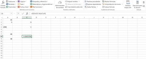 | Estadística: "DESVEST.M" Calcula la desviación estándar, según una muestra (omite los valores lógicos y de texto en la muestra), basándose en muestras de números. En este caso se utilizaron 46 y 48. | |
