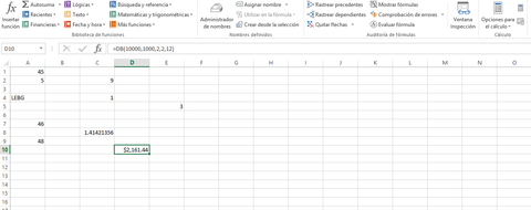 | Financieras:"DB" Devuelve la depreciación de un bien durante un período específico usando el método de depreciación de saldo fijo. | |