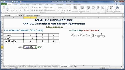 | Función Combinat La función combinat en Excel nos ayuda a obtener la cantidad de combinaciones posibles para un número determinado de elementos. Una combinación es un subconjunto de elementos sin importar su orden interno. Argumentos 1.Los argumentos deben ser números enteros, en caso contrario, Excel truncará los números. 2.Si cualquiera de los argumentos es menor a cero, o si Número < Tamaño, entonces la función combinat regresará el error #¡num! 3.Cualquier argumento que no sea un valor numérico ocasionará que la función combinat devuelva el error #¡VALOR! | trhrththtrhrt |