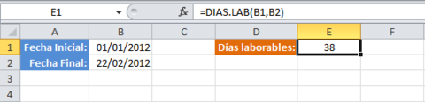 | Función Dias.Lab La función DIAS.LAB en Excel nos ayuda a obtener el número de días laborables entre dos fechas determinadas. La función DIAS.LAB nos permite especificar un conjunto de días de vacaciones que serán excluidos de los días laborables contabilizados. Argumentos 1.Fecha_inicial (obligatorio): Es la fecha a partir de la cual se comenzarán a contar los días laborables. 2.Fecha_final (obligatorio): La fecha que marca el final de la contabilización de días laborables. 3.Vacaciones (opcional): Conjunto de una o varias fechas que serán excluidas del calendario de días laborables. | |